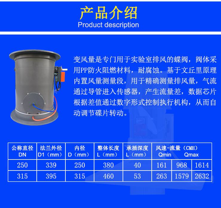 可变空气量是专门用以实验室排气的蝶阀。阀体由耐腐蚀的pp阻燃材质制成,根据文丘里(venturi)法则,内置的风量测量部分用以测量排气量。气流通过管道进入传感器并产生流量差。数据芯片根据差值以数字形式操纵执行器,从而自动调节光盘转动。